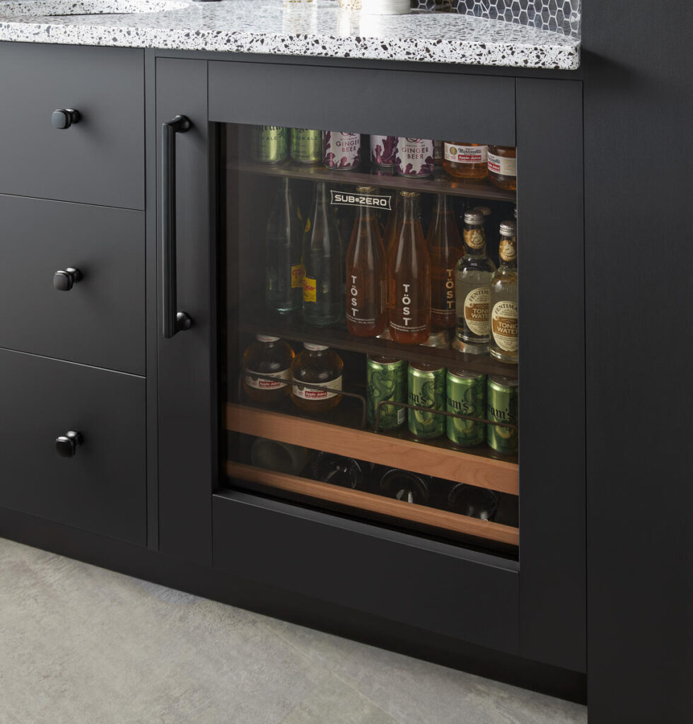 Undercounter refrigerator with glass door on which your own furniture panel or Sub-Zero stainless steel door panel with handle can be mounted.