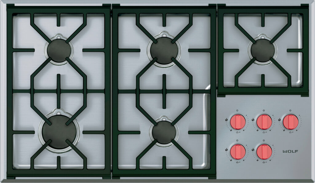 Wolf gas cooktop with five burners, Professional design.